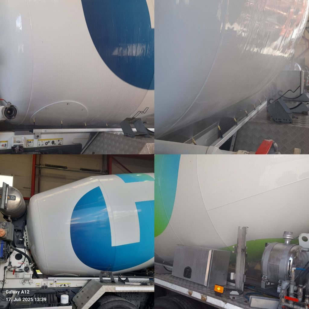 Egal ob neuer Fuhrpark oder bestehende Flotte – unser System lässt sich schnell und einfach an verschiedenste Fahrzeugsysteme anpassen. Die drei Beispiele zeigen den professionellen und sauberen Einbau an unterschiedlichen Betonmischfahrzeugen – jeweils individuell montiert, aber mit der gleichen zuverlässigen Funktion: Kühlung, Sauberkeit und Werterhalt.